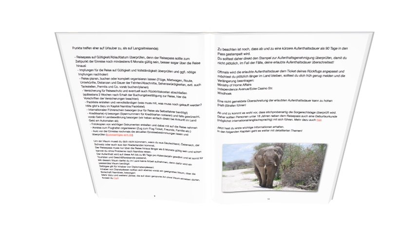 Auf 144 Seiten findest du im Namibia Reiseführer eBook* nicht nur Informationen zur Vorbereitung und Planung, wie Flugbuchung, Visum, Mietwagen, Namibia Packliste (hier geht’s zu unserer Weltreise Packliste), Reiseapotheke, Impfungen und Co, sondern ebenso Informationen für vor Ort und Unterwegs, wie Notfallrufnummern, tanken, Reifen, Verkehr, Sicherheit (inkl. Bargeldsicherheit), giftige und wilde Tiere und die komplette Route für einen Trip von ca. 20 Tagen Dauer (komplett anpassbar und somit verkürz- oder auch verlängerbar).